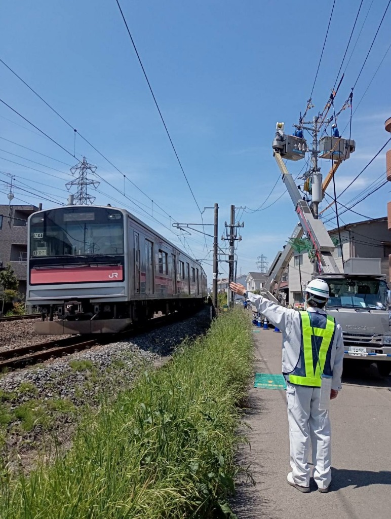5/18 本日の現場はJR仙石線、小鶴新田駅と苦竹駅の間の線路に面する場所に建柱をし、高圧線を延長する工事を しました。